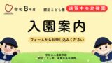 入園案内 2025-05-192025-10-04 目次 令和8年度募集要項令和7年度募集要項 令和8年度募集要項 令和8年(2026年)4月以降に入園を希望される方はこちら 令和8年度 入園願書請求フォーム令和8年4月からのご入園をお考えの方につきましては、下記フォームから申請いただくことで、入園案内資料をお送りします。受け入れ学年※ 1歳児に関しては、「保育園部分」のみの受け入れとなりますので、利用にあたっては「保育を必要とする事由」を証明... 令和7年度募集要項 令和8年(2026年)3月までに入園を希望される方はこちら 令和7年度中に入園を希望される方へ遠賀中央幼稚園は令和7年4月より、認定こども園としての運営をスタートしました。認定こども園とは、幼稚園の機能を保ちつつ、保育園の機能を追加した保育施設です。通常の保育園や幼稚園では、在園中に両親の就労状況の変更などが行われると、退園をしなけ...